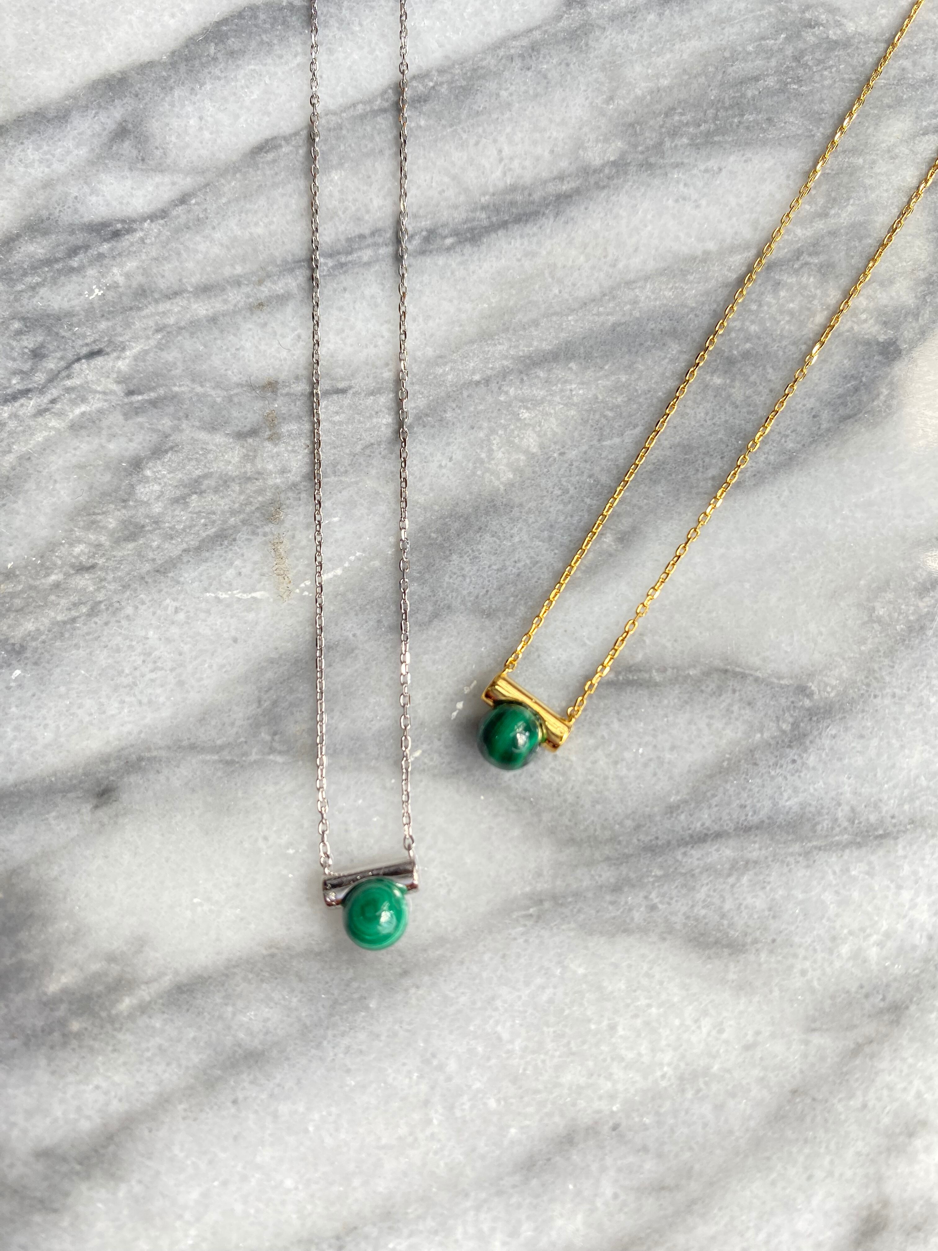 自然の美しさを身に纏える、malachite petit necklace。天然のマラカイトを使用しているので、一つ一つ風合いが異なります。1粒マラカイトが、シンプルながらもおしゃれ感を引き立てます。