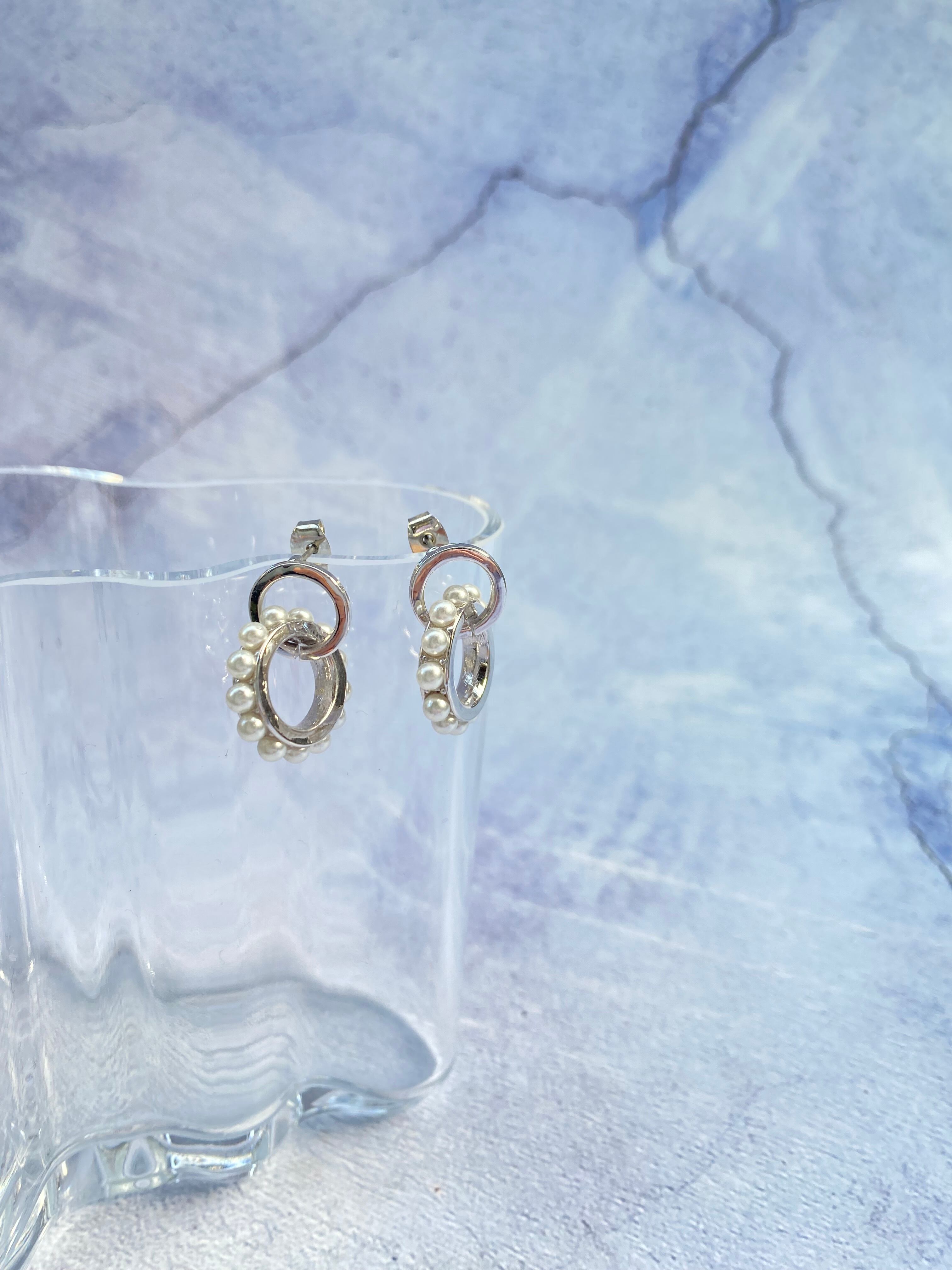 キラキラ輝くデザインパールピアスはシンプルでありながら存在感のあるアクセサリー。2つのフープが重なり合い、程よい大きさなので普段使いにぴったりです。パールがデザインに施されていて、エレガントな雰囲気を演出します。どんなコーディネートにも合わせやすく、さりげなくおしゃれを楽しむことができます。